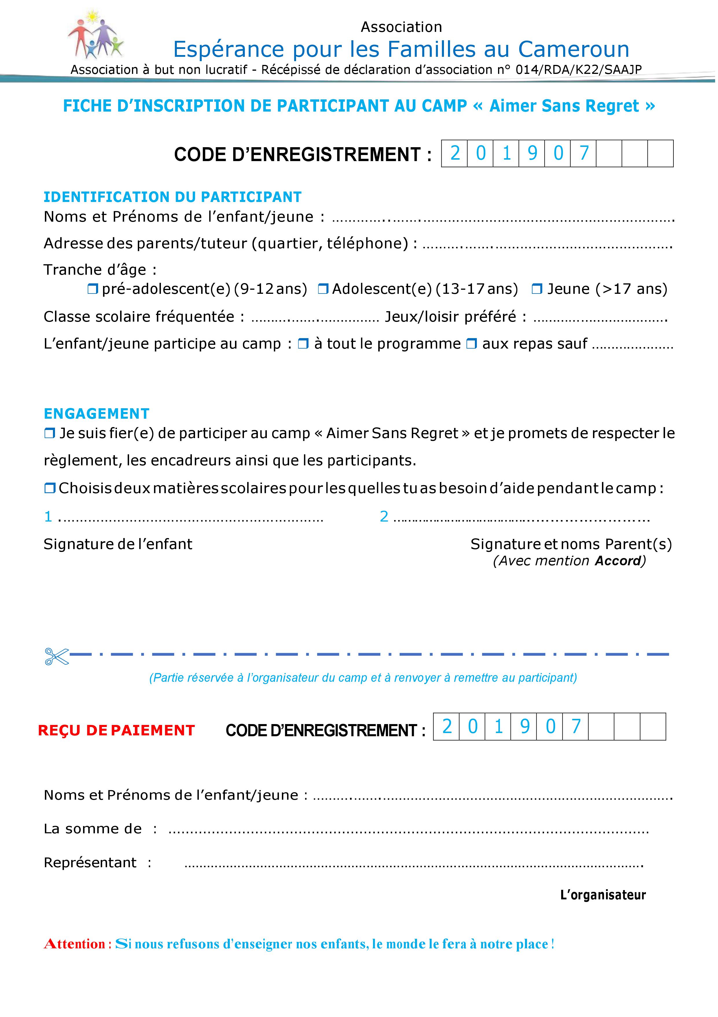 Camp ASR à Yaoundé : 3 au 6 juillet 2019 – Flyer, fiche d’inscription et infos Publié le 13 juin 201924 juin 2019 par Anne-Lise Fourniol Camp ASR Yaoundé 2019 : Flyer Cliquez ICI pour télécharger le flyer Fiche d’inscription Cliquez ICI pour télécharger la fiche d’inscription Informations camp Cliquez ICI pour télécharger la fiche d’informations + d’info. sur le Blog Cameroun.