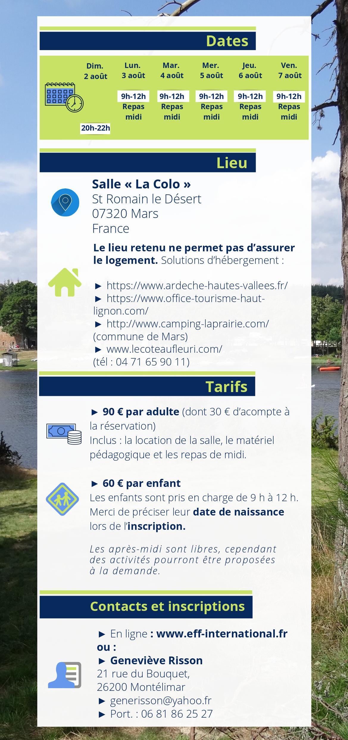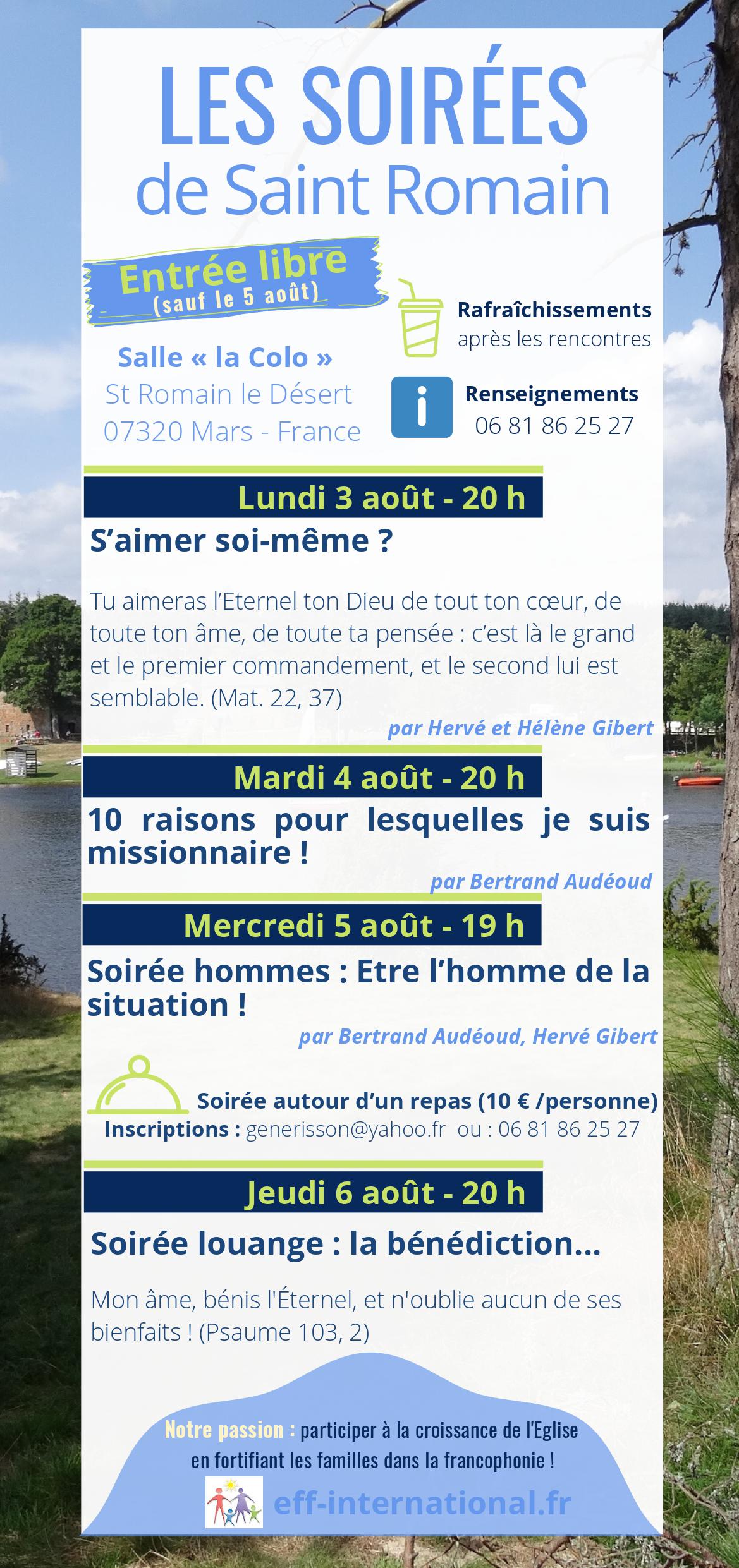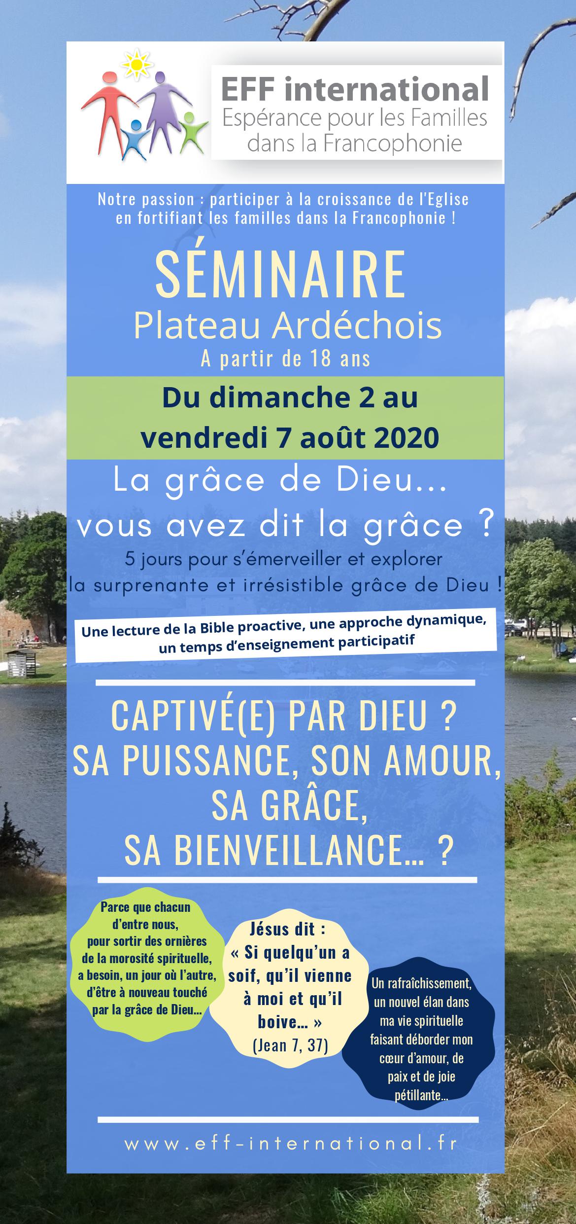 Les inscriptions au Séminaire Plateau Ardéchois 2020 sont ouvertes ! Publié le 19 mars 202019 mars 2020 par Anne-Lise Fourniol Le séminaire : du dimanche 2 août au vendredi 7 août 2020 Les soirées de Saint-Romain + d’info. sur le Blog France.